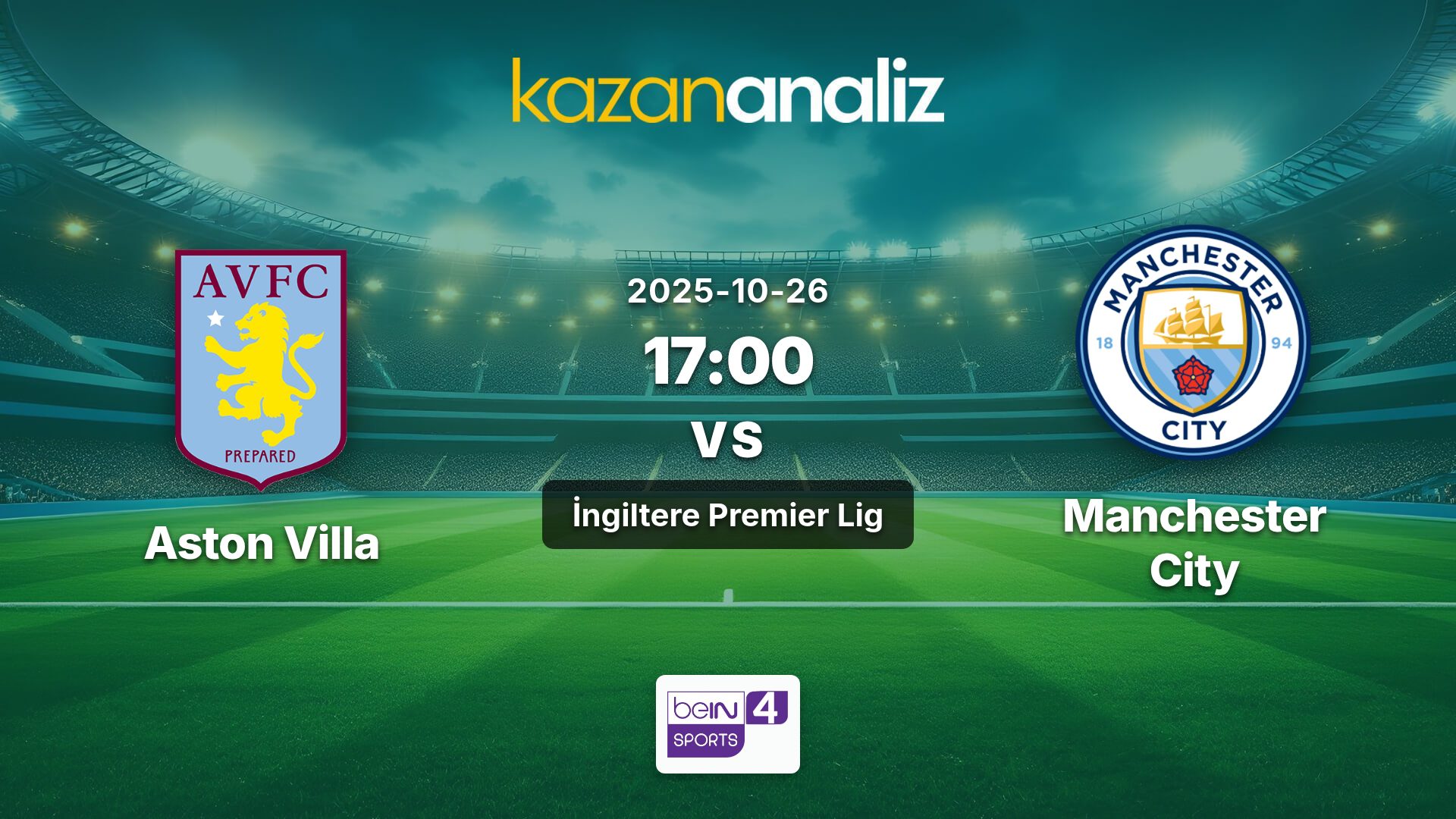 Aston Villa ile Manchester City arasındaki İngiltere Premier Lig maçı, Bein Sports 4 kanalından canlı izlenebilecek.